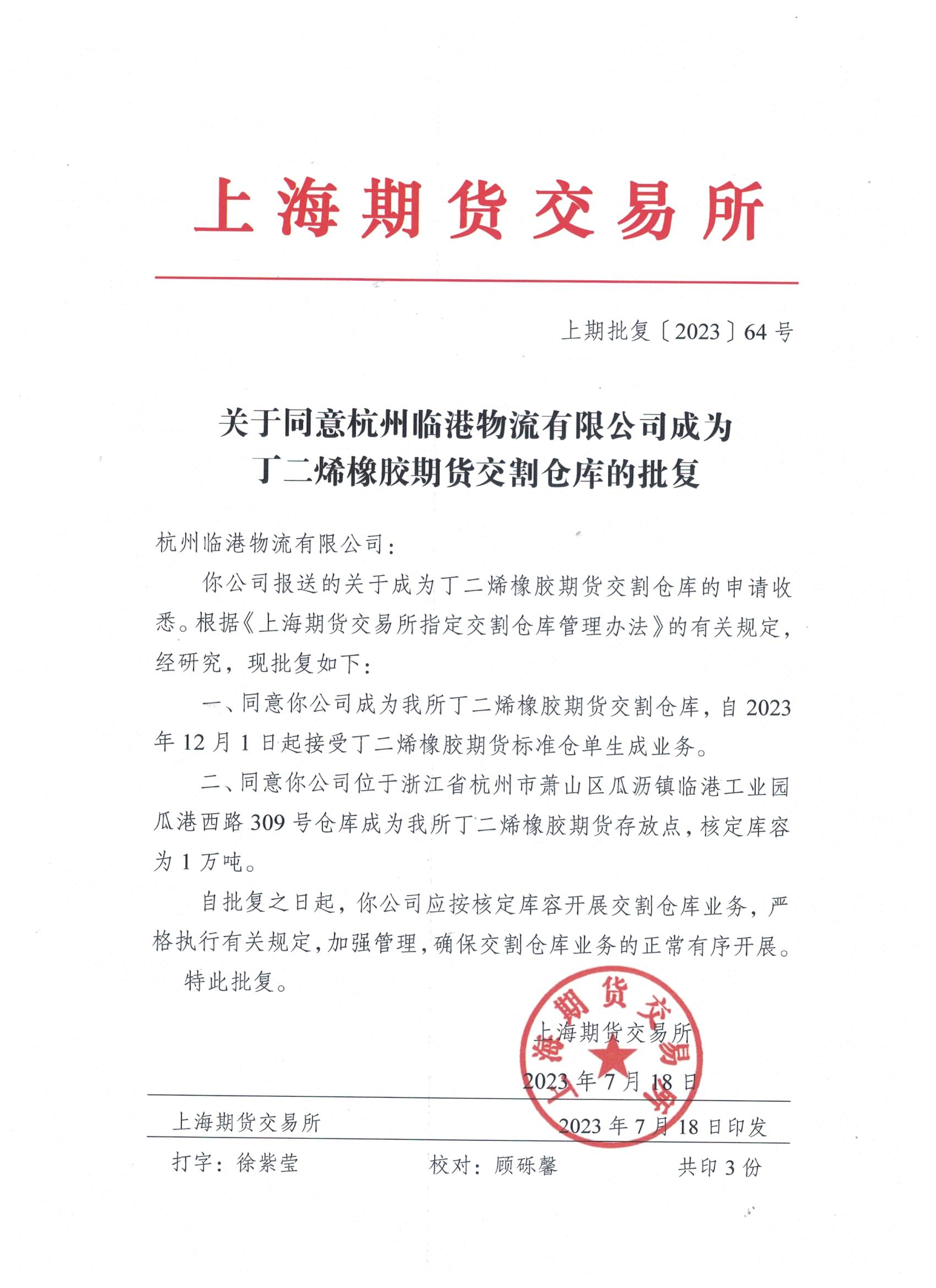 2023年7月18日,上海期货交易所发布公告,杭州临港物流有限公司成为丁二烯橡胶期货交割仓库,是国内首批丁二烯橡胶期货交割仓库,该期货和期权将于7月28日上市交易。
