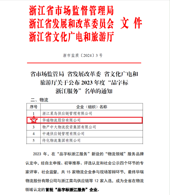 2024年4月,经过层层评审,浙江省市场监督管理局、浙江省发改委正式评定中国·必威(bw·西汉姆联)中文官方网站为浙江省首批 “品字标浙江服务”(物流行业)品牌企业。